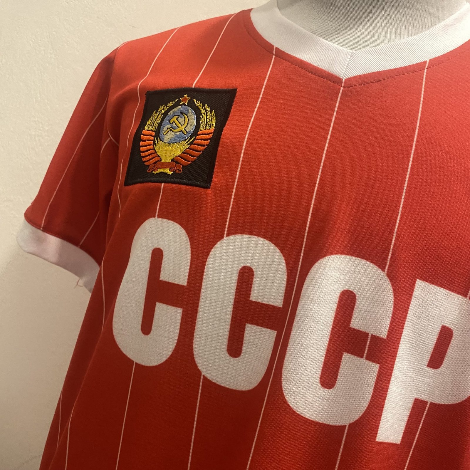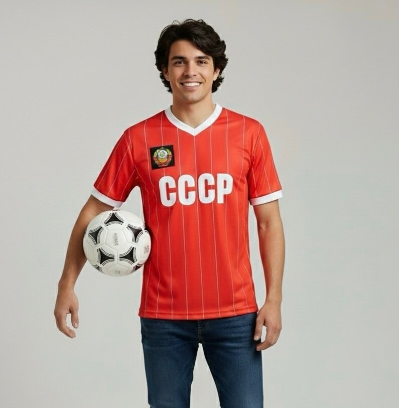 Esta camiseta de la URSS 1982 es una pieza icónica de la historia del fútbol mundial: diseño rojo intenso con finas líneas blancas verticales, cuello y mangas en contraste, y la legendaria inscripción “CCCP” en el pecho.